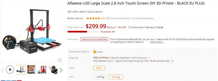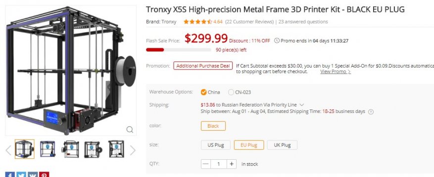 Сейчас этот принтер продается по акции ($325) и является одним из самых дешевых вариантов больших принтеров (300х300зх400 мм).